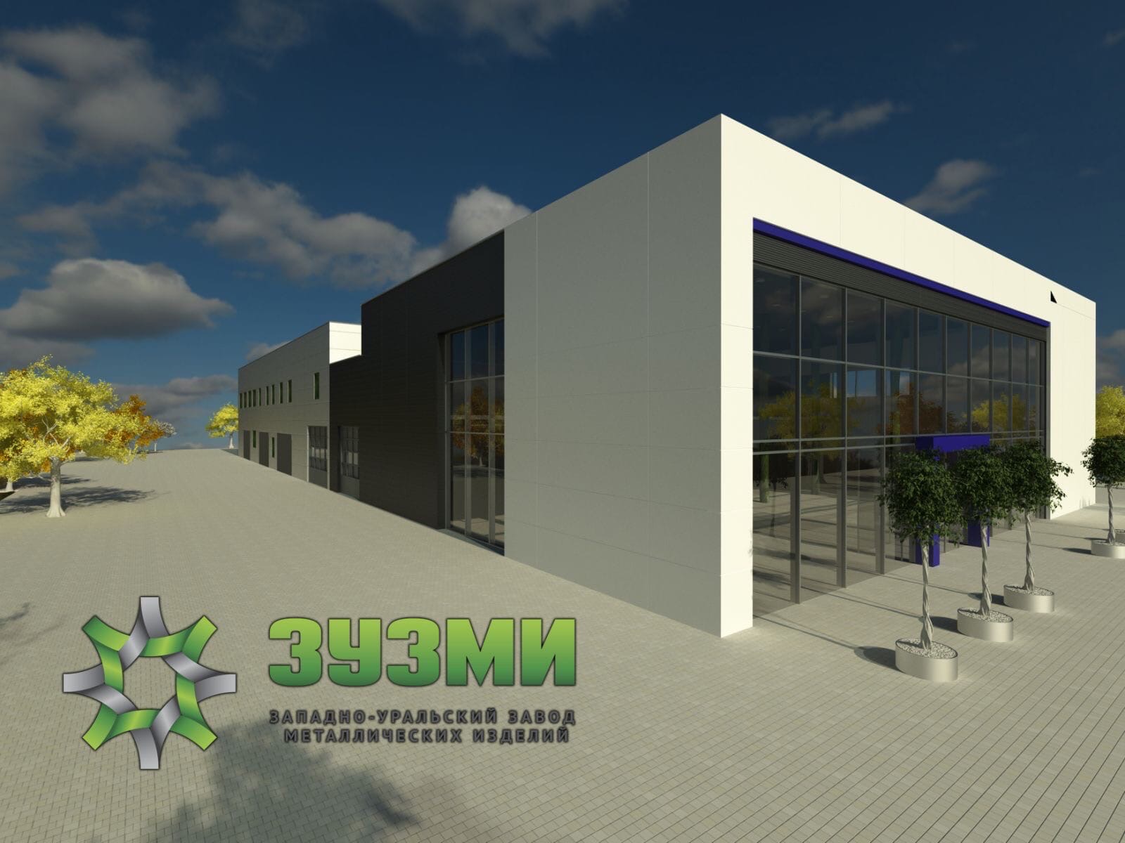 Визуализация современного завода по производству Металлоконструкций с административно-бытовым комплексом и благоустройством прилегающей территории.